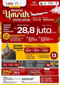 SoalIndonesia—Makassar — Awal tahun 2026 akan menjadi momen penuh berkah bagi umat Islam yang merindukan Tanah Suci. PT Annur Maarif, melalui anak perusahaannya Jenewa Rabbani Wisata (JRW), resmi membuka Promo Umrah Akbar Carter Flight untuk periode penerbangan Januari 2026. Program ini menawarkan harga ekonomis dengan paket eksklusif, menghadirkan kombinasi ideal antara kenyamanan, efisiensi, dan nilai ibadah.